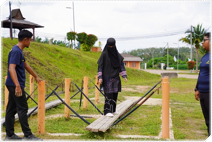 Belia Muslimah melalui titian goyang sambil dipantau oleh jurulatih.