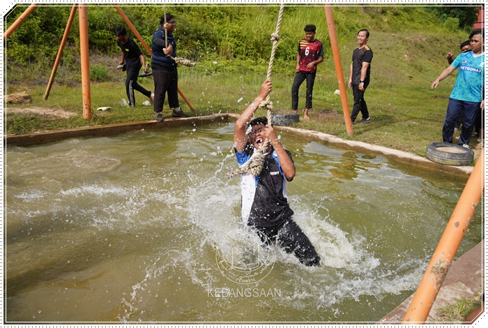 Peserta bergayut pada tali bagi melepasi cabaran kolam yang dipenuhi dengan air yang keruh.