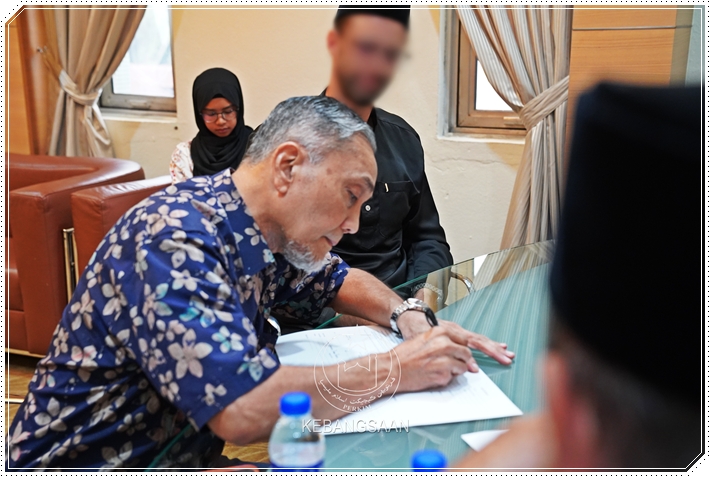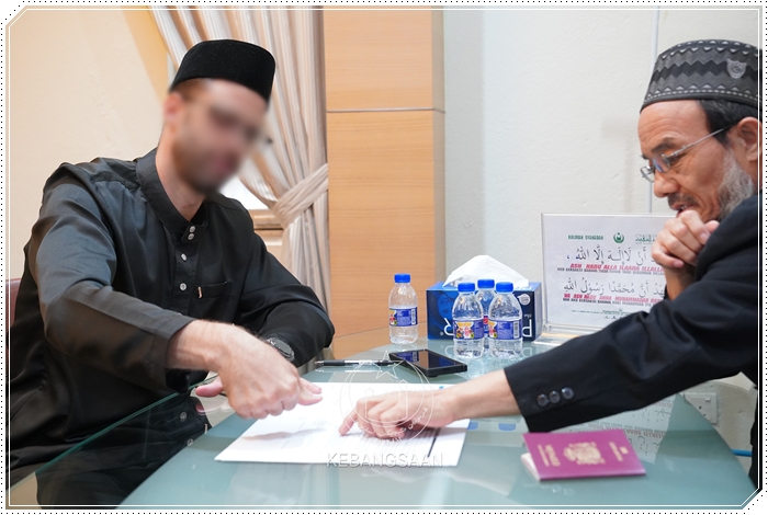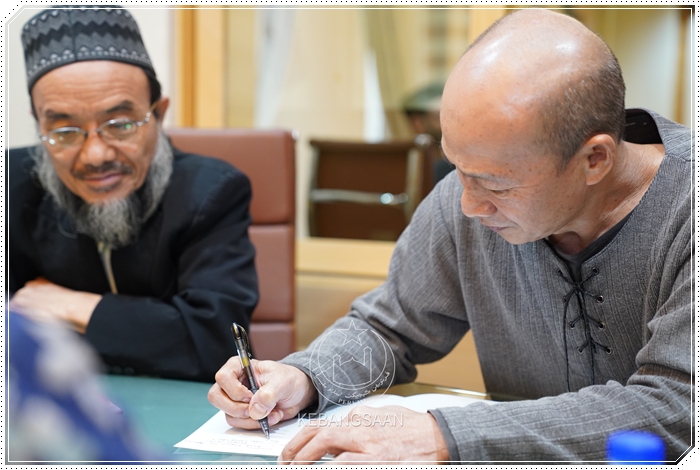 Haji Nusral melengkapkan butir-butir peribadi dan menandatangani pada borang pengislaman sebagai saksi pertama.