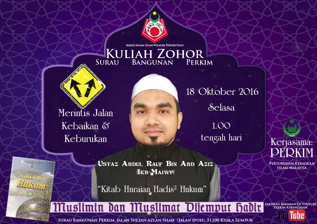 Kuliah Zohor : Ustaz Abdul Rauf – “Merintis Jalan Kebaikan & Keburukan” | 18 Oktober 2016