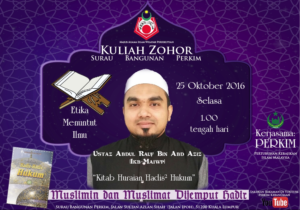 Kuliah Zohor : Ustaz Abdul Rauf – “Etika Menuntut Ilmu” | 25 Oktober 2016