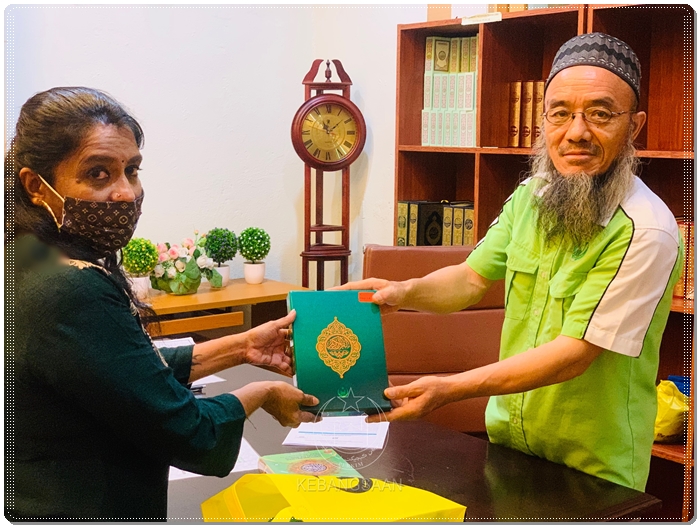 Sulaiman Ding menyampaikan senaskah al-Quran Edisi Khas Saudara Baharu kepada ibu Shazrin, Nurul Hidayah Kerashnan.