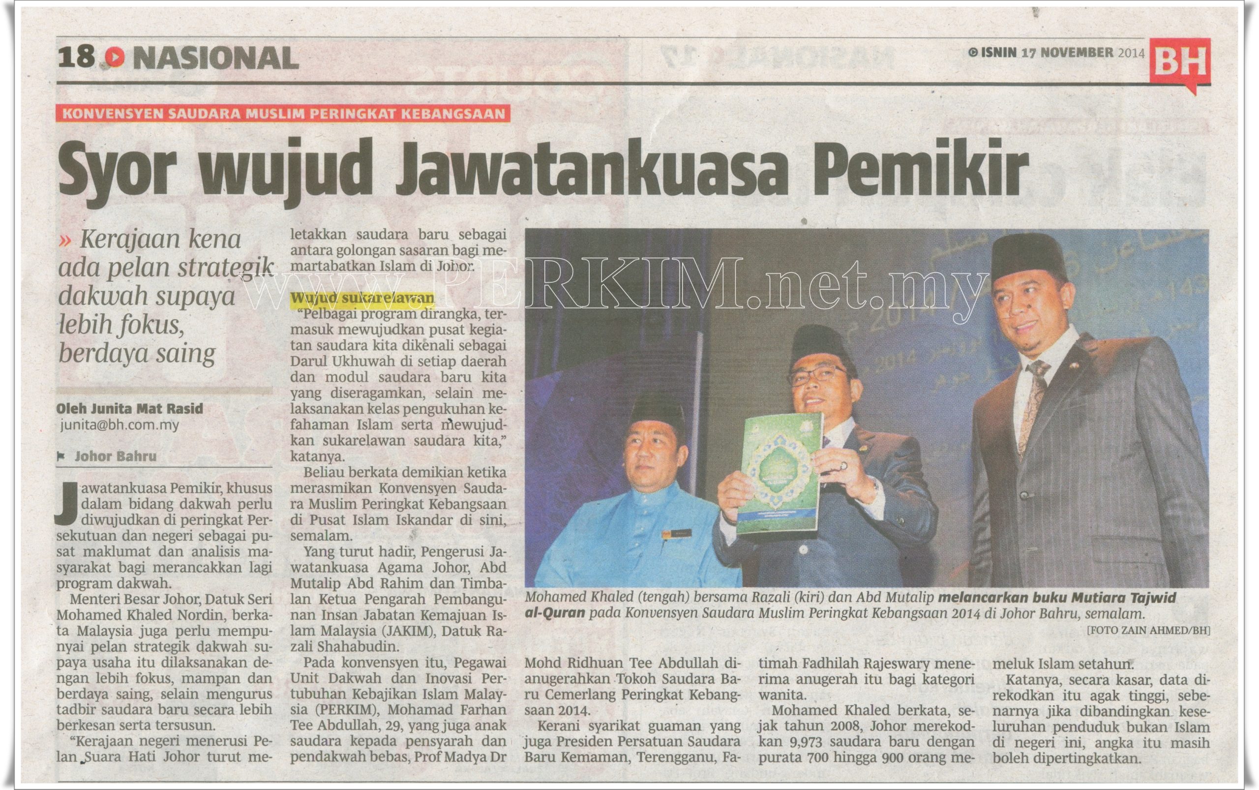 Home/Media/Keratan Akhbar/Konvensyen Saudara Muslim Peringkat Kebangsaan Keratan Akhbar Konvensyen Saudara Muslim Peringkat Kebangsaan Syahril Send an email 17 November 2014 417 Less than a minute Facebook Twitter Messenger Messenger WhatsApp Telegram Share via Email Tajuk: Konvensyen Saudara Muslim Peringkat Kebangsaan – “Syor Wujud Jawatankuasa Pemikir” Akhbar: Berita Harian Tarikh: 17 November 2014 (Isnin) Oleh: JUNITA MAT RASID Syahril Send an email 17 November 2014 417 Less than a minute Facebook Twitter Messenger Messenger WhatsApp Telegram Share via Email Share Facebook Twitter Messenger Messenger WhatsApp Telegram Share via Email Print