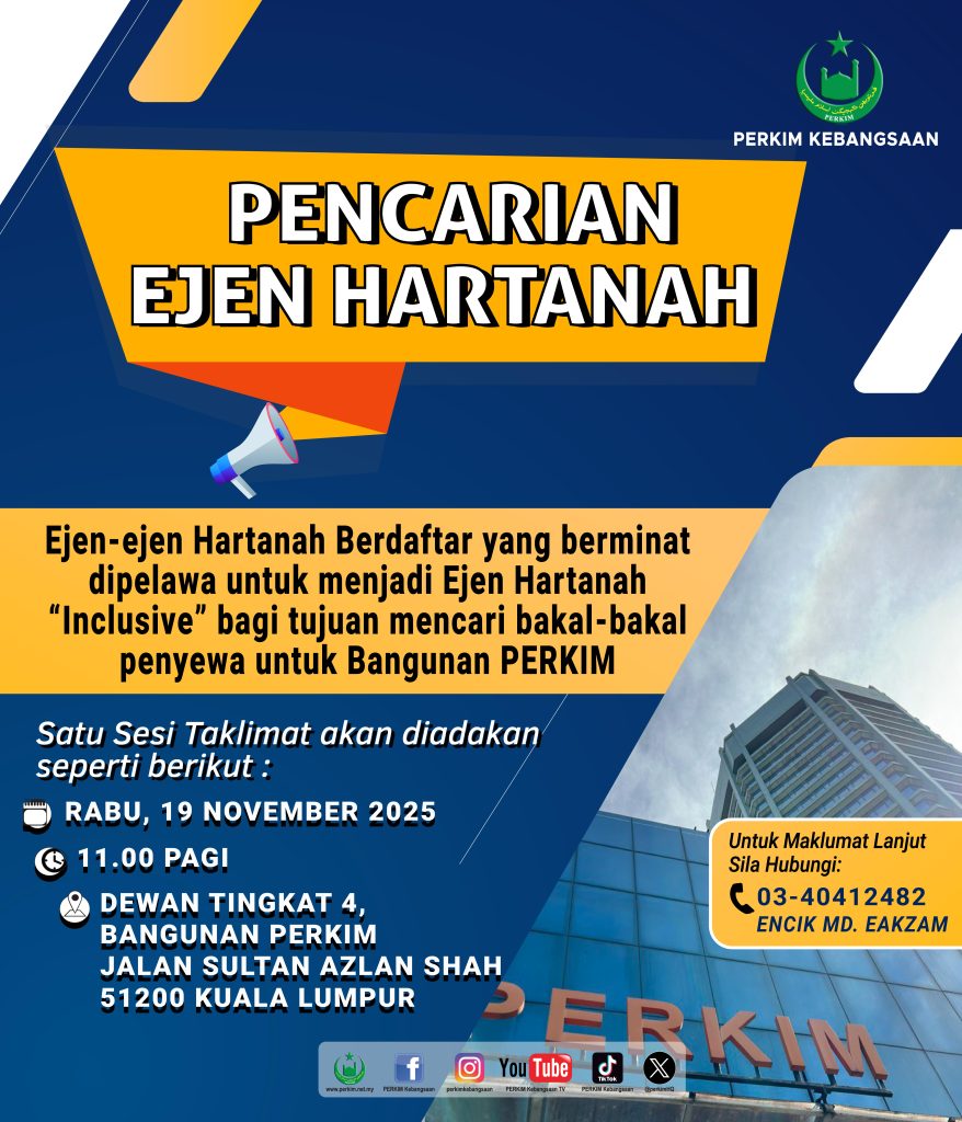 Bagi memberi penerangan lanjut tentang tawaran kerjasama ini, satu sesi taklimat khas akan diadakan pada hari Rabu, 19 November 2025, jam 11.00 pagi bertempat di Dewan Tingkat 4, Bangunan PERKIM, Jalan Sultan Azlan Shah, Kuala Lumpur.