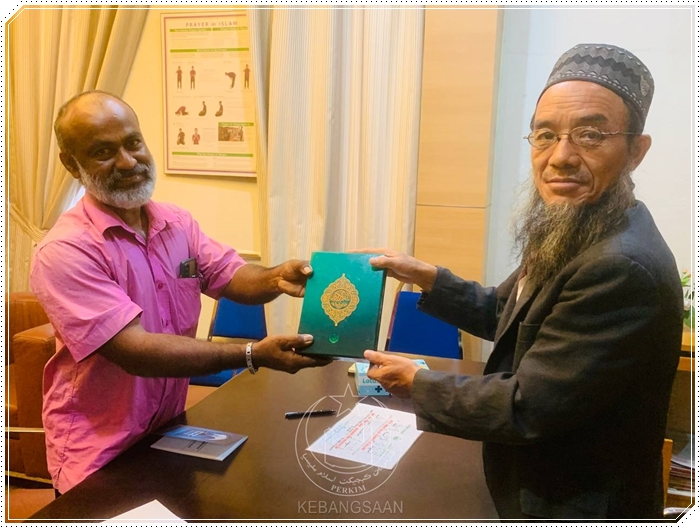 Sulaiman Ding menyampaikan senaskah al-Quran Edisi Khas Saudara Baharu kepada Anwar Raja.