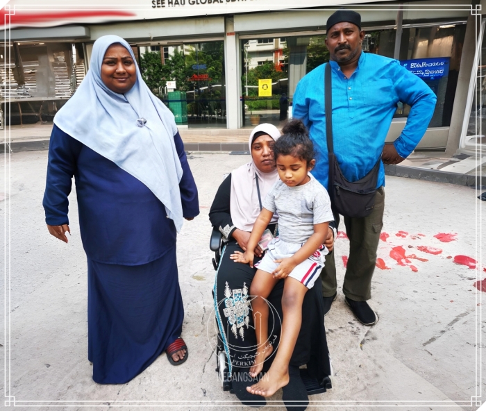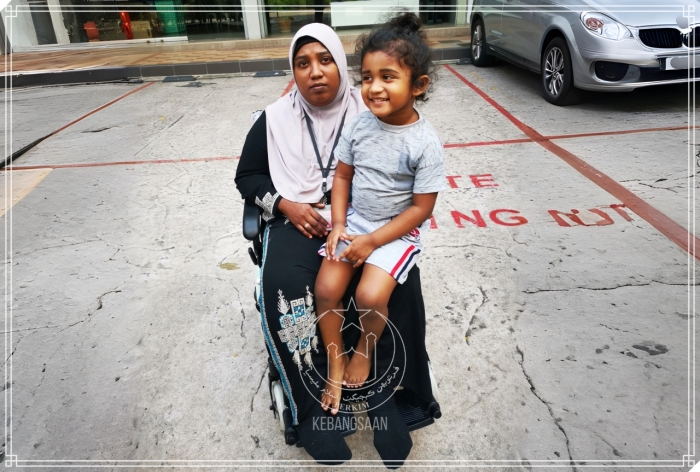 Nur Asiyah Abdullah, 33 dengan anak perempuannya di atas kerusi roda baharu yang dibelikan oleh pihak PERKIM.