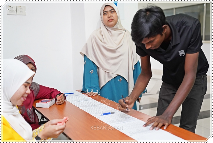 Mualaf berbangsa India memeriksa nama pada borang pendaftaran sebelum menurunkan tandatangan.