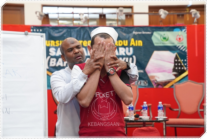 Ustaz Jais Mariappan membimbing peserta membasuh muka ketika menjalani praktikal wuduk.