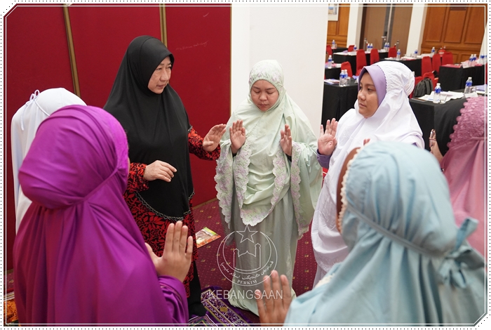 Ustazah Fatimah Ladda menunjukkan cara takbiratul ihram kepada peserta wanita.