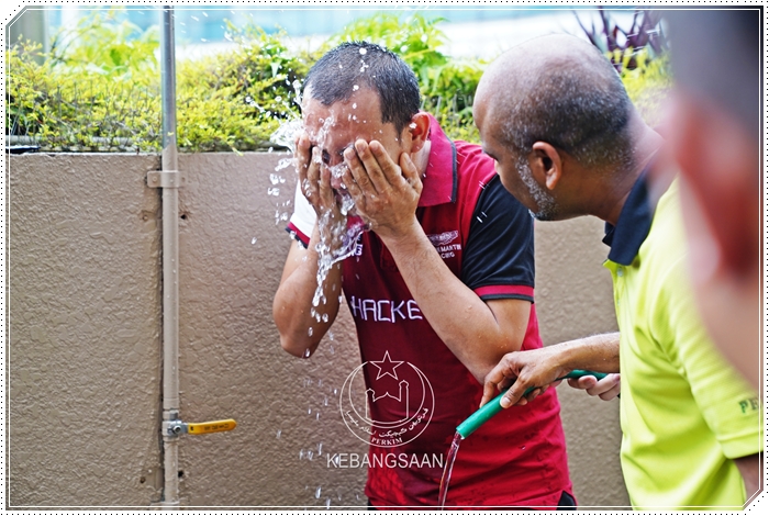 Peserta lelaki menunjukkan isyarat baik selepas selesai menjalani latihan praktikal wuduk.