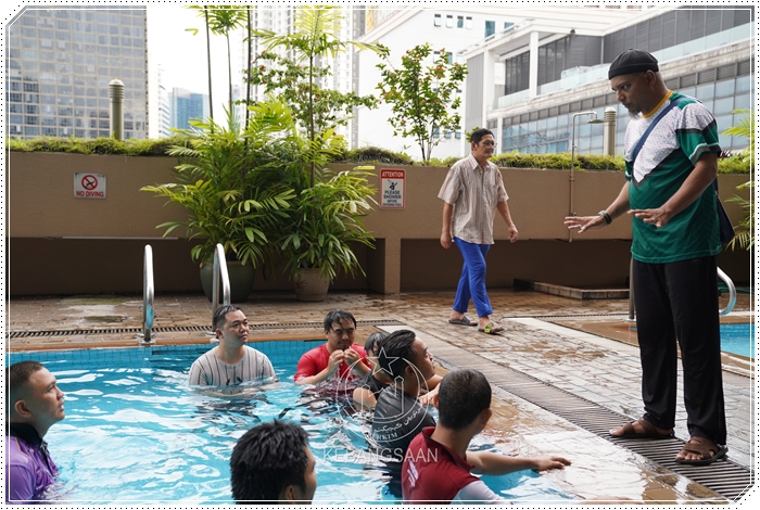 Charles menerangkan peserta lelaki cara mandi wajib ketika berada di dalam kolam renang.
