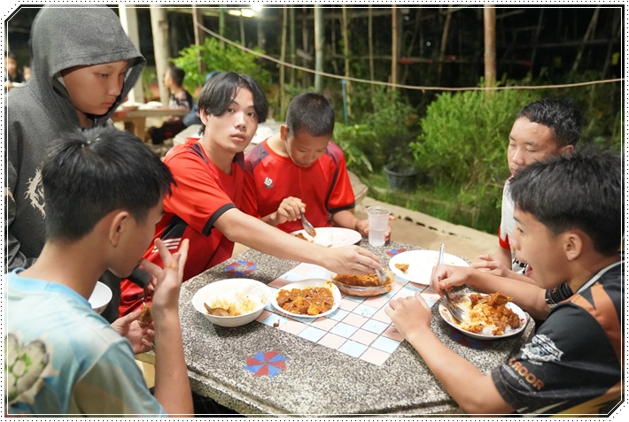Remaja As-Siddiqin menikmati hidangan kari daging bersama nasi bersama teman-temannya.