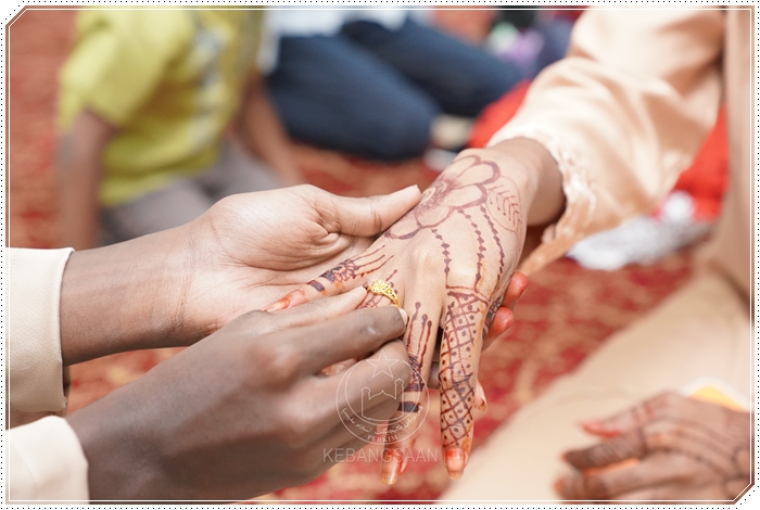 Muhammad Rahman menyarungkan cincin perkahwinan ke jari manis isterinya, Anisha.