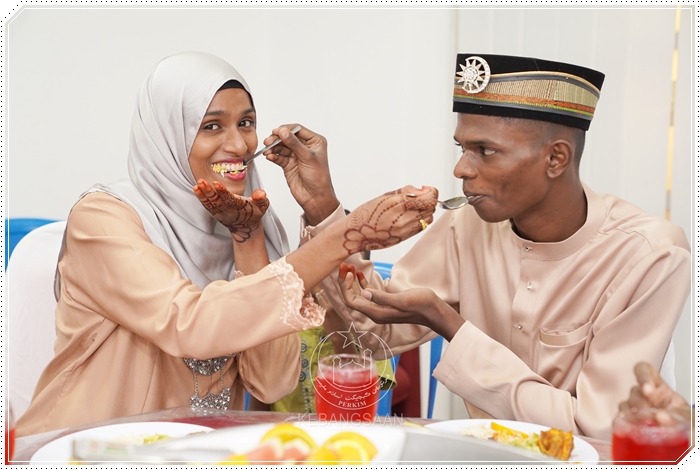 Pasangan pengantin menyuap makanan ketika majlis jamuan makan beradab.