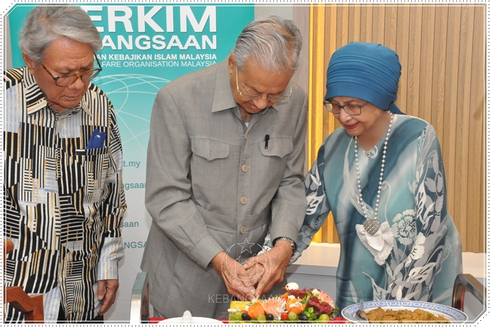 Tun Mahathir dan isteri memotong kek ulang tahun hari kelahiran sambil dinyanyikan lagu ‘Allah Selamatkan Kamu’ oleh Ahli Majlis Kebangsaan PERKIM.