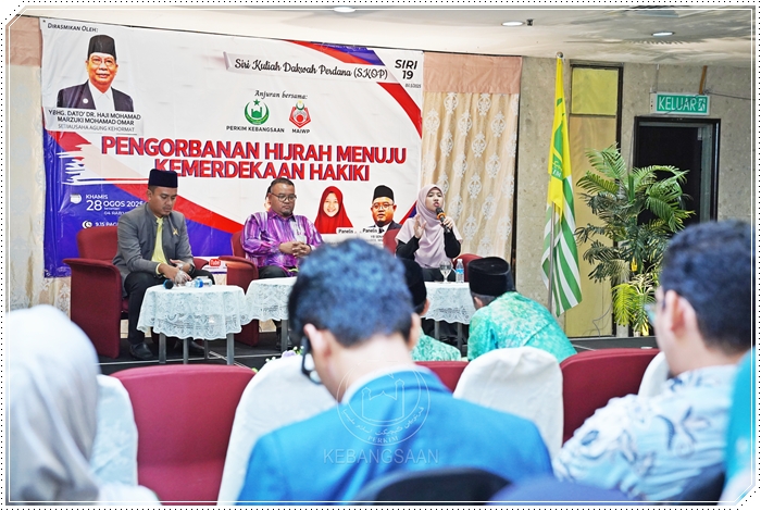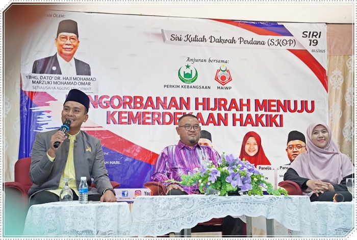 Da’i Aiman bersama dua ahli panelnya YB Senator Tuan Shahrol Wizan Sulong selaku Ahli Dewan Negara dan Juara Da’i Milenia, Da’i Nor Adibah Rozain mengupas tajuk “Pengorbanan Hijrah Menuju Kemerdekaan Hakiki”.