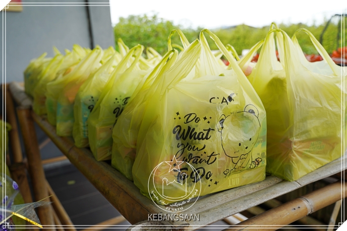 Pek makanan yang mengandungi susu kotak, aneka biskut dan tuala muka untuk diberikan kepada penghuni pusat jagaan.
